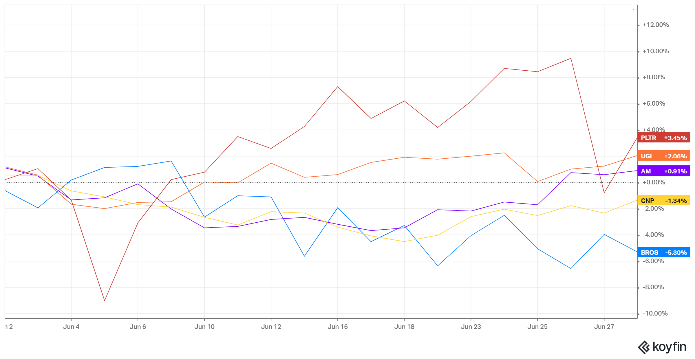 Laggards for June include holdings such as Dutch Bros (BROS), CenterPoint Energy (CNP), UGI Corp (UGI), and Palantir Technologies (PLTR):