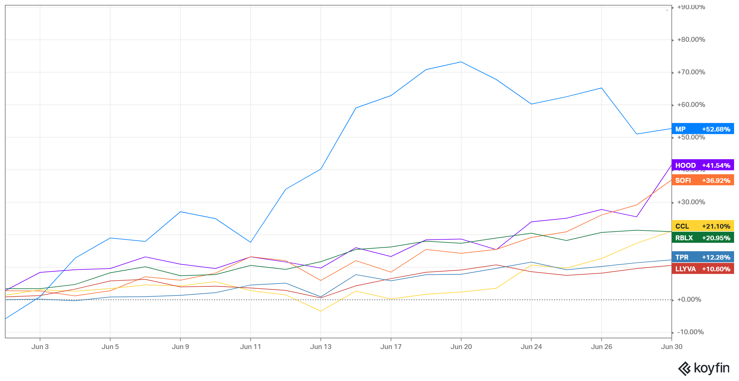 Holdings RecapAs expected, with strong outperformance for the month of June, ADPV had quite a few strong names in the portfolio with MP Materials (MP), Robinhood Market (HOOD), SoFi Technologies (SOFI), Carnival Corp (CCL), Roblox (RBLX), Liberty Live (LLYVA) and Tapestry (TPR) all posting double-digit gains for the month: