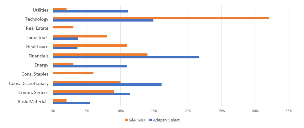 With the move back into equities, ADPV is now overweight Materials, Communication Services, Consumer Discretionary, Energy, Financials, and Utilities: