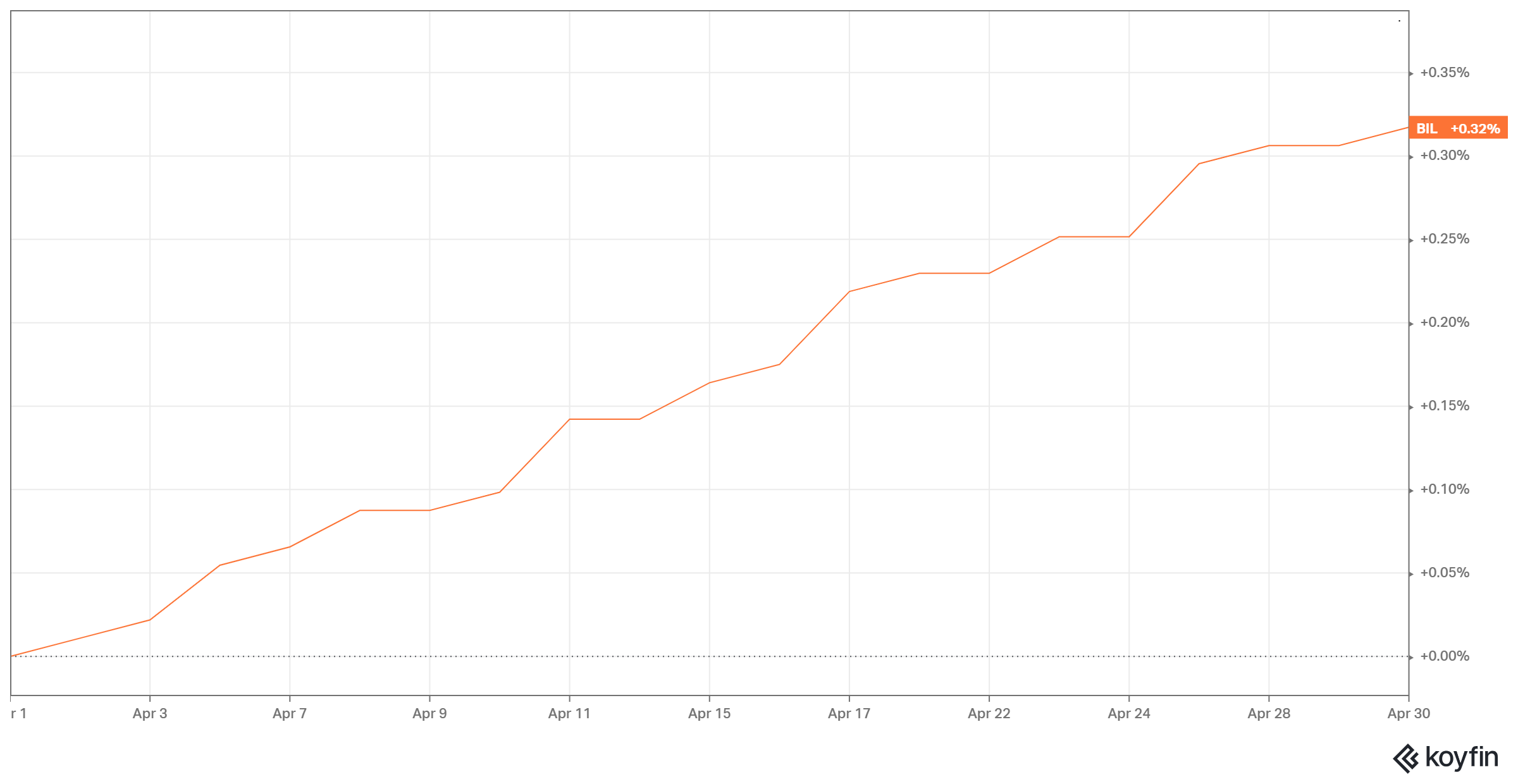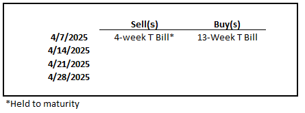 The Adaptiv select strategy saw one T-bill mature during April, replacing it with a 13-week bill.